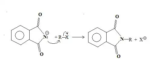 Le produit obtenu est peu basique (moins que les amidures), mais est un bon nucléophile. Il réagit avec les composés organiques halogénés, dans une réaction de substitution nucléophile bimoléculaire, de type SN2. La réaction est assez lente, mais est accélérée par chauffage et l'utilisation d'un solvant polaire aprotique, tel que le diméthylformamide (DMF).