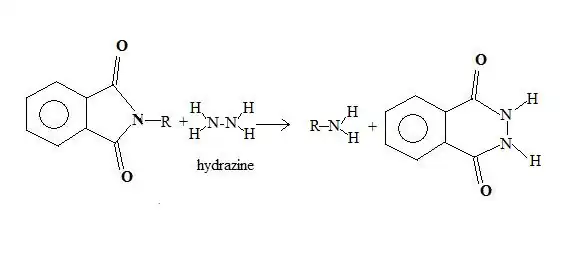 L'hydrolyse de l'intermédiaire réactionnel, en milieu basique concentré, conduit à la formation d'une amine, l'ion benzène-1,2-dioate (phtalate) étant obtenu comme sous-produit[3].
