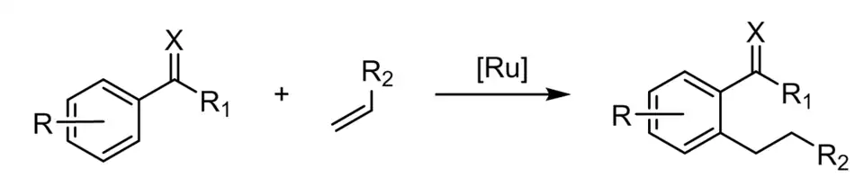 - ↑ Kakiuchi, Kochi, Mizushima et Murai, « Room-Temperature Regioselective C−H/Olefin Coupling of Aromatic Ketones Using an Activated Ruthenium Catalyst with a Carbonyl Ligand and Structural Elucidation of Key Intermediates », Journal of the American Chemical Society, vol. 132, no 50, , p. 17741–17750 (ISSN 0002-7863, PMID 21114294, DOI 10.1021/ja104918f)