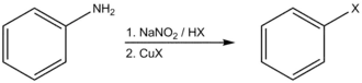 De nos jours, on appelle « réaction de Sandmeyer » toute méthode de substitution d'un groupe amine aromatique via la préparation de son sel de diazonium suivie par son remplacement par un nucléophile en présence catalytique[note 1] de sels de cuivre(I).
