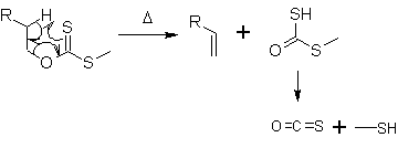 À une température d'environ 200 °C, l'alcène est ensuite formé par élimination interne : au sein d'un état de transition hexacyclique, l'atome d'oxygène du xanthate arrache l'hydrogène du carbone β dans un processus d'élimination syn. Le produit secondaire ainsi obtenu se décompose en oxysulfure de carbone (OCS) et en méthanethiol.