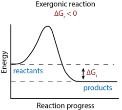 Ce sont des réactions spontanées ou ne nécessitant qu'un faible apport d'énergie, dite énergie d'activation[6],[7]. Ces réactions entrainent des ruptures de liaisons chimiques qui libèrent de l'enthalpie libre en grande quantité. Plus les molécules d'une réaction exergonique ont de liaisons chimiques, plus elles fourniront d'énergie[3].
