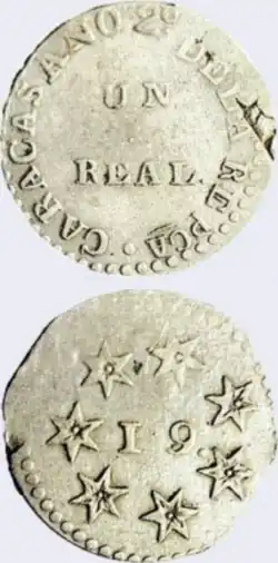 Certaines parties du territoire demeurent royalistes, comme la province du Guayana, qui frappe entre 1813 et 1817 des monnaies (¼ et ½ de réal en argent) ; le Maracaibo, avec des pièces d'½ et deux-quarts de réal en cuivre. Souvent disputée, Caracas, redevenue légaliste, continue à frapper des réaux aux armes de l'Espagne jusqu'en 1821.