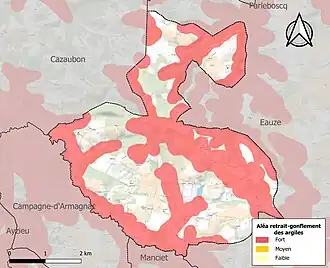 Le retrait-gonflement des sols argileux est susceptible d'engendrer des dommages importants aux bâtiments en cas d’alternance de périodes de sécheresse et de pluie. 54 % de la superficie communale est en aléa moyen ou fort (94,5 % au niveau départemental et 48,5 % au niveau national). Sur les 170 bâtiments dénombrés sur la commune en 2019, 81 sont en aléa moyen ou fort, soit 48 %, à comparer aux 93 % au niveau départemental et 54 % au niveau national. Une cartographie de l'exposition du territoire national au retrait gonflement des sols argileux est disponible sur le site du BRGM[23],[Carte 3].