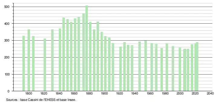 L'évolution du nombre d'habitants est connue à travers les recensements de la population effectués dans la commune depuis 1793. Pour les communes de moins de 10 000 habitants, une enquête de recensement portant sur toute la population est réalisée tous les cinq ans, les populations de référence des années intermédiaires étant quant à elles estimées par interpolation ou extrapolation[26]. Pour la commune, le premier recensement exhaustif entrant dans le cadre du nouveau dispositif a été réalisé en 2005[27].