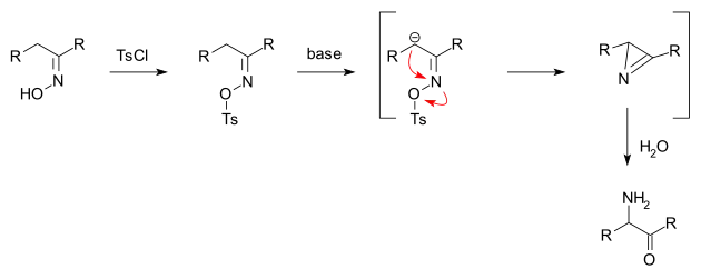 L'oxime est d'abord convertie en O-sulfonate, par exemple un tosylate sous l'action du chlorure de tosyle. L'ajout d'une base forme un carbanion qui déplace le groupe tosylate par substitution nucléophile pour former une azirine, qui est finalement hydrolysée en donnant l'aminocétone.