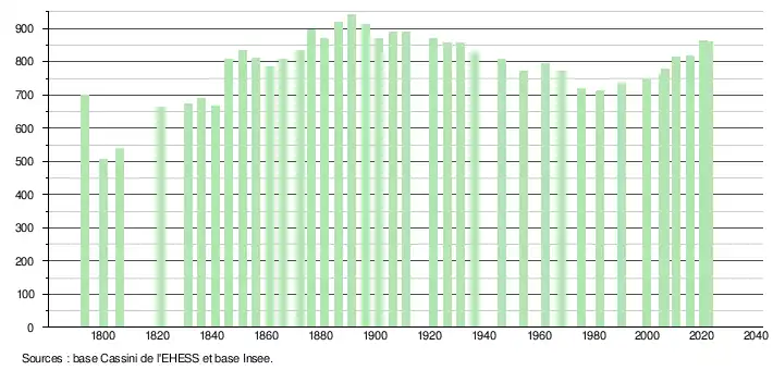 L'évolution du nombre d'habitants est connue à travers les recensements de la population effectués dans la commune depuis 1793. Pour les communes de moins de 10 000 habitants, une enquête de recensement portant sur toute la population est réalisée tous les cinq ans, les populations de référence des années intermédiaires étant quant à elles estimées par interpolation ou extrapolation[24]. Pour la commune, le premier recensement exhaustif entrant dans le cadre du nouveau dispositif a été réalisé en 2005[25].