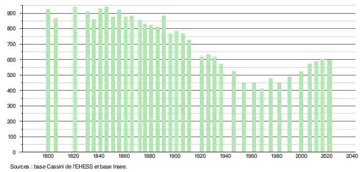 L'évolution du nombre d'habitants est connue à travers les recensements de la population effectués dans la commune depuis 1800. Pour les communes de moins de 10 000 habitants, une enquête de recensement portant sur toute la population est réalisée tous les cinq ans, les populations de référence des années intermédiaires étant quant à elles estimées par interpolation ou extrapolation[26]. Pour la commune, le premier recensement exhaustif entrant dans le cadre du nouveau dispositif a été réalisé en 2006[27].
