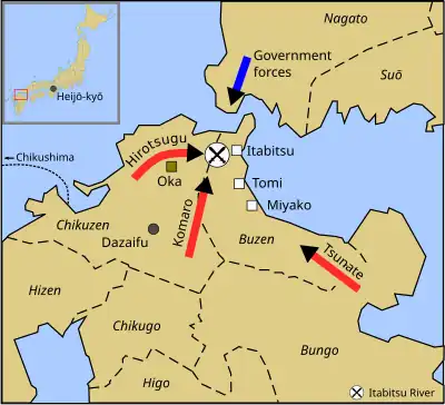 Afin d'encercler les forces gouvernementales, Hirotsugu divise son armée en trois unités : l'une sous son commandement et les autres sous le commandement de ses subordonnés, respectivement Tsunade et Komaro. Ensemble, ils avancent le long de différentes routes vers le nord de Kyūshū où le détroit de Kanmon sépare Kyūshū de Honshū, l'île principale du Japon. En route, le [d 5], Hirotsugu s'arrête au quartier général du district d'Oka pour « dresser le camp, préparer ses arbalètes, élever les signaux de balise et former les conscrits de la province de Chikuzen »[8]. Finalement, il arrive aux fortifications (chinsho) dans le district de Miyako, province de Buzen près de la route d'invasion attendue[8]. Mais les plans de Hirotsugu pour une attaque organisée sont déjoués parce qu'une armée de plusieurs milliers d'hommes n'arrive pas et qu'une autre unité est en retard. L'armée gouvernementale débarque avec succès sur Kyūshū, s'empare d'hommes et d'armes dans les trois camps de Tomi, Itabitsu et Miyako dans la province de Buzen[d 6],[1]. Plus tôt, l'armée de la cour a été renforcée les 16/[d 7] de plus de 4 000 hommes dont 40 bons soldats (jōhei) du district de Toyoura dans la province de Nagato[1]. Le [d 8], plusieurs alliés de Hirotsugu se rendent et changent de camp : quatre fonctionnaires du district font défection avec 500 guerriers à cheval et un citoyen de la province de Buzen tue un des rebelles. Plus tard, un officiel d'un district de Buzen revient avec les têtes de plusieurs rebelles tués à la bataille[1]. Le [d 9], un décret impérial est distribué parmi la population et les responsables de Kyūshū, en vue de discréditer Hirotsugu et promettant des récompenses à qui le tuerait[nb 5]