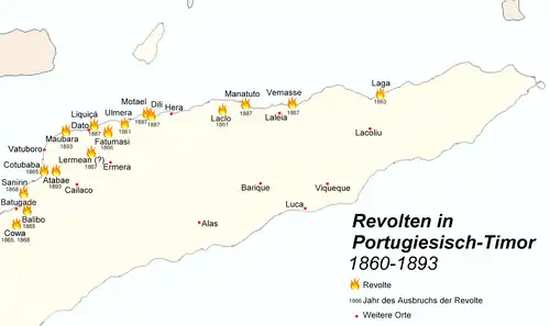 - (de) Cet article est partiellement ou en totalité issu de l’article de Wikipédia en allemand intitulé « Rebellionen in Portugiesisch-Timor (1860–1912) » (voir la liste des auteurs).