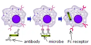 Lorsque des molécules d'IgG, spécifiques à un antigène ou à des composants membranaires donnés, se lient à l'agent pathogène dans leurs régions Fab (fragment antigen binding région), leurs régions Fc pointent vers l'extérieur, à portée immédiate des phagocytes. Les phagocytes lient ces régions Fc régions avec leurs récepteurs Fc. De nombreuses interactions de faible affinité se produisent entre les récepteurs et les anticorps qui travaillent ensemble pour se lier fermement aux microbes enveloppés d'anticorps. La faible affinité individuelle empêche les récepteurs Fc de se lier aux anticorps en l'absence d'antigène, et, par conséquent, réduit la probabilité de l'activation des cellules immunitaires en l'absence d'infection. Cela empêche également l'agglutination des phagocytes par des anticorps lorsqu'il n'y a pas d'antigène. Après qu'un agent pathogène a été lié, les interactions entre la région Fc de l'anticorps et les récepteurs Fc des phagocytes provoquent l'initiation de le phagocytose. L'agent pathogène est englouti par les phagocytes par un processus actif impliquant la liaison et la libération du complexe région Fc/récepteur Fc, jusqu'à ce que la membrane cellulaire de la phagocyte recouvre entièrement l'agent pathogène[26].