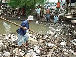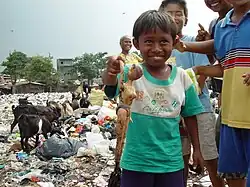 - ↑ Le 10 juillet 2000, à la suite de violentes pluies, un pan entier d'une montagne de déchets s'effondre à la décharge de Payatas, à Manille. 200 personnes y meurent enterrées sous les ordures, principalement des femmes relativement âgées et ceux qui se déplaçaient le moins facilement. Source : Stephanie Lepsoe, op cit.