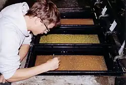 - Des piscicultures spécialisées produisent chaque année des millions de poissons qui servent à ensemencer ou réensemencer des rivières, fleuves, canaux ou plans d'eau. Les progrès de la génomique et des analyses génétiques appliqués à la biologie de la conservation des ressources génétiques halieutiques, des salmonidés notamment[5] ont permis de confirmer les problèmes de pollution et appauvrissement génétique posés par les réintroductions à partir de souches d'élevages génétiquement trop homogènes et pauvres.