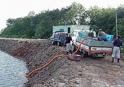- L'ensemencement halieutique est aussi une source possible de diffusion de parasites et pathogènes[3]. La concentration des poissons dans les bassins de pisciculture ou dans l'espace restreint des cages flottantes augmente fortement le risque d'épidémies et encourage les éleveurs à l'utilisation de traitements antibiotiques, ce qui favorise l'apparition et la circulation de souches de pathogènes antibiorésistantes.