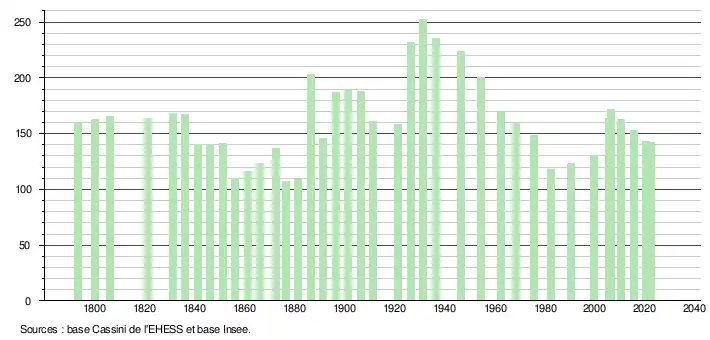 L'évolution du nombre d'habitants est connue à travers les recensements de la population effectués dans la commune depuis 1793. Pour les communes de moins de 10 000 habitants, une enquête de recensement portant sur toute la population est réalisée tous les cinq ans, les populations de référence des années intermédiaires étant quant à elles estimées par interpolation ou extrapolation[20]. Pour la commune, le premier recensement exhaustif entrant dans le cadre du nouveau dispositif a été réalisé en 2005[21].