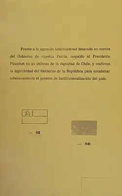 Après la condamnation en décembre 1977 par l'Assemblée générale des Nations unies, par 95 voix contre 14 et 12 abstentions, du « régime militaire pour ses abus en matière de droit de l'homme »[2] Pinochet avait décidé d'organiser un plébiscite, mettant ainsi les autres membres de la junte devant le fait accompli[3], le général Gustavo Leigh dénonçant le « caractère plébiscitaire de la consultation » et le risque de nuire au prestige de l'armée[4].