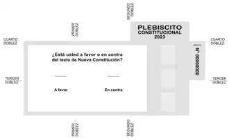 Le vote final du projet de Constitution par l'Assemblée constituante intervient le 30 octobre 2023, suivi de la remise officielle du texte au président Gabriel Boric le 7 novembre. Le même jour, ce dernier signe le décret de convocation du référendum pour le 17 décembre suivant[34],[35]. Un total de 15 406 352 électeurs sont invités à se rendre aux urnes, dont 127 552 Chiliens de la diaspora[36]. Comme lors du référendum de 2022 et des élections constituantes de 2023, le vote est rendu obligatoire sous peine d'une amende de 0,5 à 3 unités fiscales mensuelles en fonction des revenus de la personne, soit environ 30 à 190 peso chilien. Sont cependant exemptés les électeurs malades, en déplacement à l'étranger ou à plus de 200 kilomètres de leur domicile, ou pouvant se faire reconnaître dans l'incapacité de participer à un vote[37],[38].