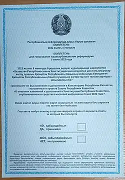 Une réforme constitutionnelle est déposée le 22 avril suivant au Conseil constitutionnel[1]. Portant sur un total de 56 modifications de 33 articles, la révision est soumise à un référendum constitutionnel par le président de la République, qui dispose du pouvoir de convoquer un tel scrutin à sa discrétion en vertu de l'article 44 de la Constitution de 1995[1],[20]. Tokaïev décide néanmoins le 29 avril de solliciter l'avis des deux chambres du Parlement, toutes deux dominées par le parti présidentiel, l'Amanat. La chambre basse, le Majilis, vote la révision par 98 voix pour et 0 contre le 4 mai. Sur recommandation de la chambre haute, le Sénat, le texte est néanmoins modifié puis revoté le lendemain par 96 voix pour et 0 contre afin de conserver les protections accordées aux anciens présidents de la République, dont Noursoultan Nazarbaïev. Le jour même, le Conseil constitutionnel donne son accord, suivi de la convocation par Tokaïev du référendum pour le 5 juin 2022[1].