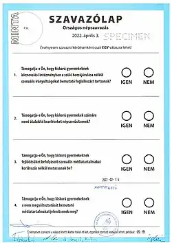 Le 9 novembre 2021, l'Assemblée nationale vote à une large majorité l'organisation d'un référendum sur ces questions. Après le rejet à l'unanimité par la Cour constitutionnelle hongroise d'un recours déposé par l'opposition, le Président de la République János Áder décide le 11 janvier 2022 de fixer le scrutin au suivant, en même temps que les élections législatives[8].