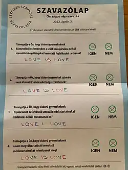 Une dizaine de groupes de défense des droits LGBT et des droits de l'Homme en général — dont la branche hongroise d'Amnesty international — appellent les électeurs à rendre délibérément leur bulletins de votes invalides en cochant à la fois Oui et Non, de manière que le nombre de votes valides n'atteigne pas le quorum de 50 % des inscrits[9].