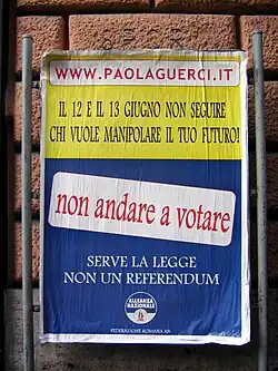 Le président de la Conférence épiscopale italienne, le cardinal Camillo Ruini, a appelé « tous les catholiques à s'abstenir de voter ». En effet, suivant la constitution italienne, si la participation est inférieure à 50 %, la consultation sera considérée comme nulle, objectif affiché du cardinal Ruini. Dans ces conditions, s'abstenir est plus efficace que voter non pour les opposants à cette révision.