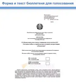 La question posée est « Êtes-vous favorable à la construction d'une centrale nucléaire au Kazakhstan ? ». Elle figure sur le bulletin de vote en kazakh et en russe, toutes deux langues officielles du pays[23]. Le référendum est convoqué dans les conditions de l'article 44 de la Constitution, qui donne ce pouvoir au Président de la république. Pour être validé, il doit cependant réunir les votes favorables de la majorité absolue des suffrages exprimés, ainsi qu'un taux de participation supérieur au quorum de la moitié du total des inscrits sur les listes électorales[23],[24],[25].