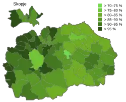 Plus de 90 % des votants se prononcent en faveur de la proposition, pour un total de 609 427 votes Oui sur 666 344 votants, bien au-dessus du seuil de la majorité absolue de 50 % + 1 établi à 333 173 votants par la CEN[7]. Cependant, le référendum n'est pas validé dans la mesure où moins de 50 % des inscrits se sont déplacés aux urnes. Le résultat ne prend par conséquent pas un caractère impératif, laissant libre le parlement de le voter ou non. Outre le succès de la campagne de boycott de l'opposition — bien que non assumée ouvertement en tant que telle sous la pression des gouvernements européens —, le caractère périmé des listes électorales vieilles de seize ans aurait participé à grossir l'abstention, entre 300 000 et 400 000 Macédoniens ayant émigrés depuis, soit entre 17 et 22 % du total des inscrits[2].