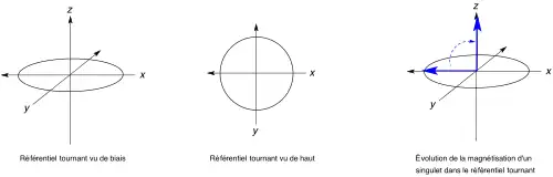 Pour visualiser l'évolution d'un groupe de spins, il est préférable de se placer dans le cas où l'on observe uniquement ce groupe, c'est-à-dire où la référence tourne à la même fréquence que le signal de précession libre des spins à observer (la fréquence de Larmor). Si le signal est un singulet, il ne tourne pas dans le référentiel tournant (parce que la magnétisation du singulet et le référentiel tournent à la même vitesse, par définition).