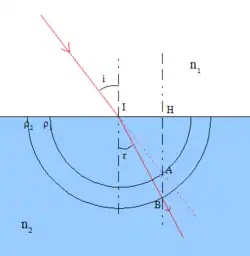 Cette construction repose sur le tracé des « cercles des indices ». On trace les deux cercles de rayon et centrés sur le point d'incidence (I). Le rayon incident (provenant du milieu 1) est prolongé dans le milieu 2 et coupe le cercle 1 en un point A dont la projection H est telle que, par construction, IH = .