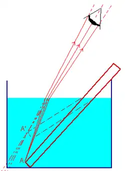 On constate alors que, les rayons étant réfractés en s'écartant de la normale, puisque l'indice de l'air est inférieur à l'indice de l'eau, la lumière qui arrive dans l'œil de l'observateur semble provenir d'un point plus élevé.