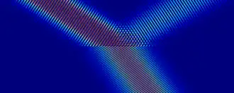 Résultat d'une simulation électromagnétique réalisée avec le programme Moosh montrant une réfraction par un dioptre entre deux milieux d'indice et .