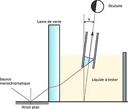 Le liquide est dans une cuve dont le fond est à lame parallèle. Cette lame est éclairée en incidence rasante par-dessous. Tout se passe donc comme si le liquide était éclairé en incidence rasante depuis l'air. Un viseur récupère le rayon et détermine son angle.