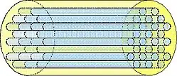 (En jaune), le réfrigérant circule autour des tubes bleus et échange ses calories avec l'eau
