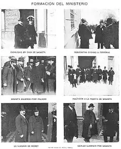 Sagasta forma un gouvernement dit de notables car il incluait tous les chefs de faction du Parti libéral, y compris le général López Domínguez qui avait réintégré ses rangs, et les républicains possibilistes d’Emilio Castelar — que Cánovas obligea à abjurer de son républicanisme par la voix de Melchor Almagro —, et dut s'efforcer de concilier les postures droitières et protectionnistes de Germán Gamazo avec celles libre-échangistes et plus à gauche de Segismundo Moret. Au portefeuille du Budget, Gamazo se proposa d’atteindre l’équilibre budgétaire mais son projet se vit frustré par l'augmentation des dépenses causée par la brève guerre de Melilla (en), entre octobre 1893 et avril 1894. Le conflit fut déclenché par la construction d’un fort dans une zone proche de Sidi Guariach, à proximité d’où se trouvait une mosquée et un cimetière, ce qui fut considéré par les Rifains comme une profanation. De durs combats eurent lieu, notamment l’épisode du siège du fort de Cabrerizas Altas (es), où près d’un millier d'hommes furent encerclés et qui se solda par 41 morts et 121 blessés parmi les forces espagnoles[59]