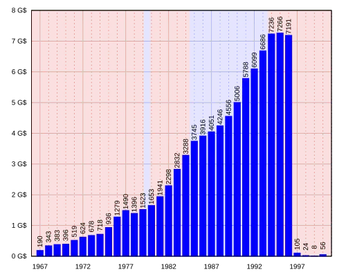 | Historique des transferts fédéraux au Canada[1] | |||||||||||||||||||||||||||||||||||||||||||||||||||||||||||||||||||||||||||||||||||||||||||||||||||||||||||||||||||||||||||||||||||||||||||||||||||||||||||||||||||||||||||||||||||||||||||||||||||||||||||||||||||||||||||||||||||||||||||||||||||||||||||||||||||||||||||||||||||||||||||||||||||||||||||||||||||