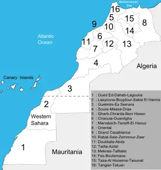 Le Maroc comprend 12 régions ; elles se divisent en 62 provinces et 13 préfectures[2]. Parmi ces 12 régions, une se trouve entièrement sur le territoire non autonome du Sahara occidental, et deux partiellement.