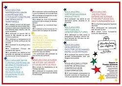 - Article 9 : développer la démocratie locale par l’implication permanente des citoyens dans les prises de décision politique et par l’usage du référendum d’initiative populaire.