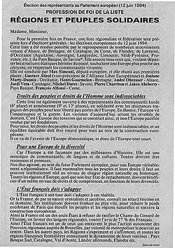 En , des partis régionalistes alsaciens, basques, bretons, catalans, corses, occitans et savoyards présentent une liste commune pour les élections européennes. Intitulée « Régions et peuples solidaires », elle est menée par Max Simeoni et rassemble également quelques personnalités issues de la société civile dont le chanteur Renaud qui partagent une sympathie pour le régionalisme. La liste obtient 76 436 voix (0,39 % des suffrages exprimés). le , ces partis, réunis à Aix-en-Provence, décident de continuer la dynamique de cette liste en créant un mouvement politique du nom de Régions et peuples solidaires. Le Congrès constitutif se tient les 11-, à Rennes[L 1].