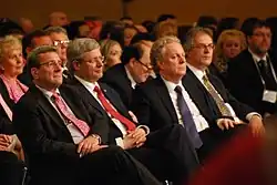 Régis Labeaume en compagnie du premier ministre du Canada, Stephen Harper, et du premier ministre du Québec, Jean Charest, en 2012.