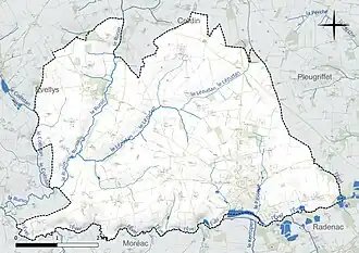 La commune est située dans le bassin Loire-Bretagne. Elle est drainée par l'Evel, le Runio, le Coëtdan[2], le Lézudan[3], le ruisseau le Passoué[4] et divers autres petits cours d'eau[5],[Carte 1].
