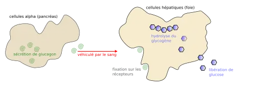 Le glucagon (ou l'adrénaline) se fixe sur son récepteur qui change alors de conformation pour interagir avec une protéine Gs. La sous-unité αs de cette protéine se détache pour aller activer une adénylate cyclase. Celle-ci hydrolyse alors l'ATP en AMP cyclique. Les AMPc constituent le messager secondaire, ils se fixent sur la PKA pour en libérer les sous-unités calytiques. La PKA peut alors initier une réponse rapide ou une réponse lente :