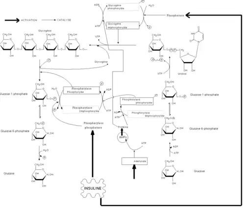 L'insuline active une autre enzyme, la phosphatase responsable de la déphosphorylation d'une autre enzyme, la glycogène synthase qui, phosphorylée, est inactive. Cette dernière entraîne la synthèse du glycogène (mise en réserve du glucose).