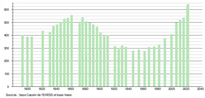 L'évolution du nombre d'habitants est connue à travers les recensements de la population effectués dans la commune depuis 1793. Pour les communes de moins de 10 000 habitants, une enquête de recensement portant sur toute la population est réalisée tous les cinq ans, les populations de référence des années intermédiaires étant quant à elles estimées par interpolation ou extrapolation[51]. Pour la commune, le premier recensement exhaustif entrant dans le cadre du nouveau dispositif a été réalisé en 2006[52].
