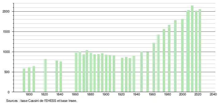 L'évolution du nombre d'habitants est connue à travers les recensements de la population effectués dans la commune depuis 1793. Pour les communes de moins de 10 000 habitants, une enquête de recensement portant sur toute la population est réalisée tous les cinq ans, les populations de référence des années intermédiaires étant quant à elles estimées par interpolation ou extrapolation[21]. Pour la commune, le premier recensement exhaustif entrant dans le cadre du nouveau dispositif a été réalisé en 2007[22].