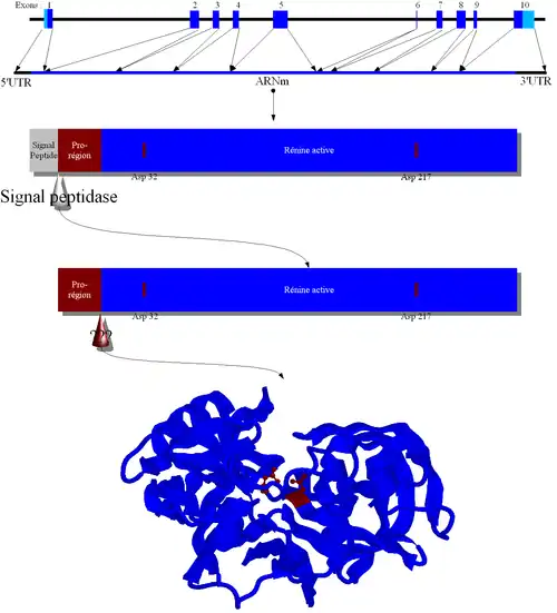 La rénine est d'abord synthétisée sous forme de prorénine qui est libérée dans le plasma. Cette prorénine est clivée en rénine active au niveau de l'appareil juxta-glomérulaire rénal[4]. Elle peut être également activée sans clivage par une liaison à un récepteur spécifique[5], entraînant un changement conformationnel. Ce récepteur permet l'activation de l'angiotensinogène mais a également d'autres rôles en induisant la production d'autres molécules (transforming growth factor (TGF)-β et plasminogen activator inhibitor (PAI)-1) dont le rôle reste à déterminer[6].