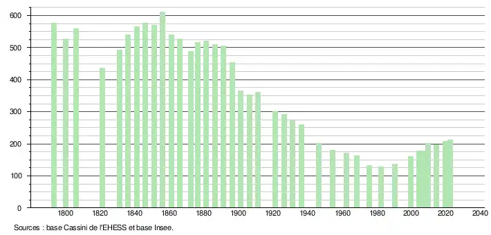 L'évolution du nombre d'habitants est connue à travers les recensements de la population effectués dans la commune depuis 1793. Pour les communes de moins de 10 000 habitants, une enquête de recensement portant sur toute la population est réalisée tous les cinq ans, les populations de référence des années intermédiaires étant quant à elles estimées par interpolation ou extrapolation[18]. Pour la commune, le premier recensement exhaustif entrant dans le cadre du nouveau dispositif a été réalisé en 2004[19].