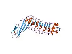Une répétition riche en leucine, ou leucine-rich repeat (LRR) en anglais, est un motif structurel présent dans certaines protéines où il forme un repliement en fer à cheval α/β[4],[5]. Ce type de repliement est constitué de séquences de 20 à 30 résidus d'acides aminés contenant une forte proportion de leucine, un acide aminé hydrophobe, constituant un domaine en forme de solénoïde. Chaque élément répété est généralement constitué de l'enchaînement feuillet β–coude–hélice α, dont la répétition constitue un domaine qui présente globalement la géométrie d'un fer à cheval dont l'intérieur est formé de feuillets β parallèles et l'extérieur est formé d'un réseau d'hélices α. Une face des feuillets β et un côté des hélices α sont exposés au solvant et sont par conséquent constitués essentiellement de résidus hydrophiles, tandis que la région comprise entre les hélices et les feuillets forme le cœur hydrophobe de la protéine dans lequel sont enfouis les résidus de leucine.