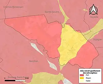 Le retrait-gonflement des sols argileux est susceptible d'engendrer des dommages importants aux bâtiments en cas d’alternance de périodes de sécheresse et de pluie. La totalité de la commune est en aléa moyen ou fort (67,4 % au niveau départemental et 48,5 % au niveau national). Sur les 288 bâtiments dénombrés sur la commune en 2019, 288 sont en aléa moyen ou fort, soit 100 %, à comparer aux 81 % au niveau départemental et 54 % au niveau national. Une cartographie de l'exposition du territoire national au retrait gonflement des sols argileux est disponible sur le site du BRGM[20],[Carte 3].