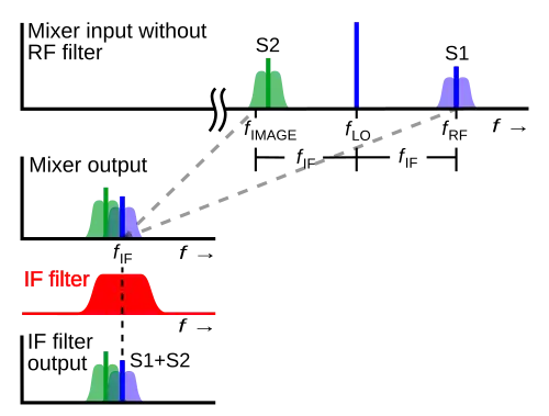 Dans un tel récepteur radio, un oscillateur local (OL) est utilisé pour mélanger ou effectuer le "battement" du signal radiofréquence (RF) entrant, générant des fréquences de somme et de différence. L'une d'entre elles sera à la fréquence intermédiaire (FI) et sera sélectionnée et amplifiée. Le récepteur radio est sensible à tout signal à sa fréquence FI, y compris les signaux non désirés. Par exemple, avec un OL réglé sur 110 MHz, il existe deux fréquences de signaux entrants qui peuvent générer une fréquence FI de 10 MHz. Un signal diffusé à 100 MHz (le signal utile) et mélangé à l'OL de 110 MHz créera la fréquence somme de 210 MHz (ignorée par le récepteur) et la fréquence différence à la fréquence souhaitée de 10 MHz. En revanche, un signal diffusé à 120 MHz (le signal non désiré) et mélangé à l'OL de 110 MHz créera une fréquence totale de 230 MHz (ignorée par le récepteur), et la fréquence de différence sera également de 10 MHz. Le signal à 120 MHz est appelé "image" du signal utile à 100 MHz. La capacité du récepteur à rejeter cette image donne le taux de réjection d'image (IMRR) du système.