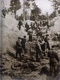 L'Union soviétique n'a jamais officiellement déclaré la guerre à la Pologne et a cessé de reconnaître l'État polonais au début de l'invasion[2]. Les Soviétiques n'ont pas classé le personnel militaire polonais comme des prisonniers de guerre, mais comme des rebelles contre le nouveau gouvernement soviétique dans l'ouest de l'Ukraine et l'ouest de la Biélorussie. Le règne de la terreur par le NKVD et d'autres services de répression de l'Union soviétique a débuté dès comme une partie inhérente de la soviétisation des Kresy. Les premières victimes du nouvel ordre furent environ 250 000 prisonniers de guerre polonais capturés par l'URSS pendant et après l'invasion de la Pologne. L'Union soviétique n'ayant jamais signé de conventions internationales sur les règles de la guerre, les prisonniers polonais se sont vu refuser le statut juridique de prisonniers de guerre. Les forces soviétiques ont assassiné la quasi-totalité des officiers capturés (soit plus de 25 000 personnes) et envoyé de nombreux soldats ordinaires au goulag soviétique[14],[15]. Dans une atrocité notoire ordonnée par Staline, la police secrète soviétique a systématiquement fusillé les cadres militaires et civils de l'ancien État polonais, dans une région reculée lors du massacre de Katyn. Parmi les quelque 14 471 victimes figuraient notamment quelques officiers généraux, de très nombreux officiers subalternes et supérieurs de l'armée d'active polonaise, des officiers de réserve, des dirigeants politiques, des responsables gouvernementaux, des cadres administratifs et des intellectuels. Quelque 4 254 cadavres ont été découverts dans les charniers de la forêt de Katyne par les nazis en 1943, qui ont invité un groupe international de représentants neutres et de médecins à examiner les cadavres et à confirmer la culpabilité soviétique[7]. Plus de 15 000 Polonais ont été tués dans le massacre de Katyn[11],[16], mais des milliers d'autres ont été victimes des massacres de prisonniers du NKVD au milieu de 1941, avant l'avance allemande à travers la zone d'occupation soviétique.